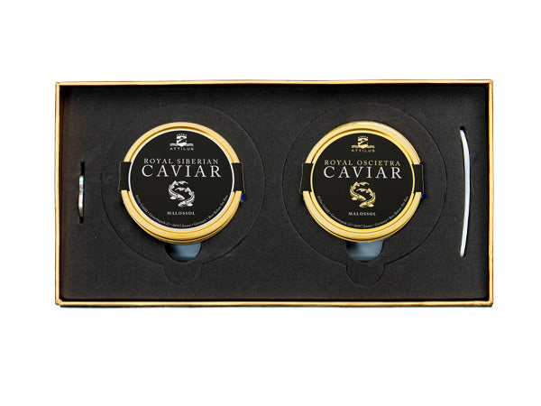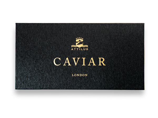 This caviar set is presented in an elegant, specifically designed exclusive Attilus Gift Box with two tins of caviar from our selection, as well as a Mother-of-pearl spoon and a caviar tin opener. The sets are available for 50 and 125g tins.